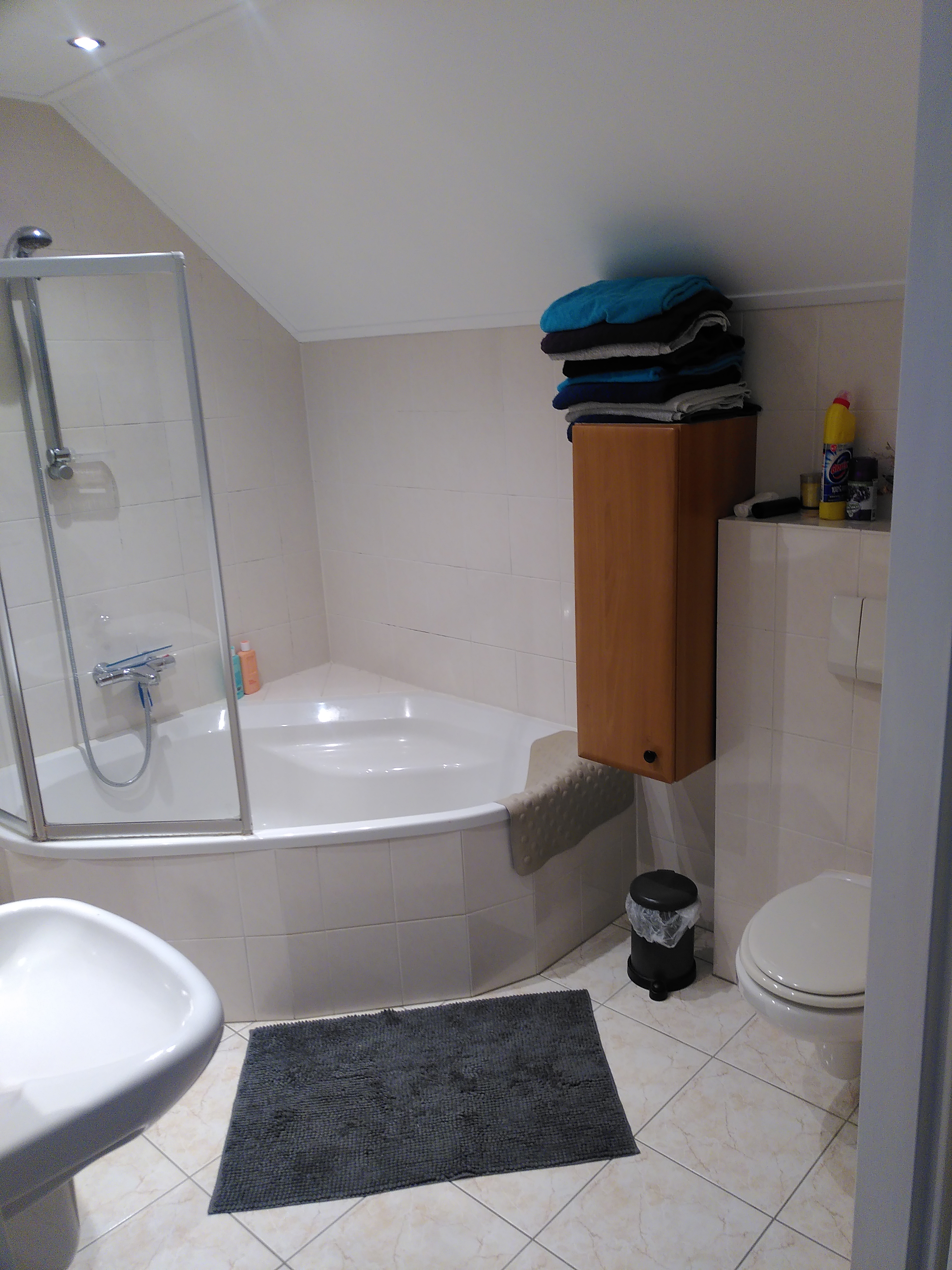 De badkamer is voorzien van een ligbad met twee wastafels en toilet.