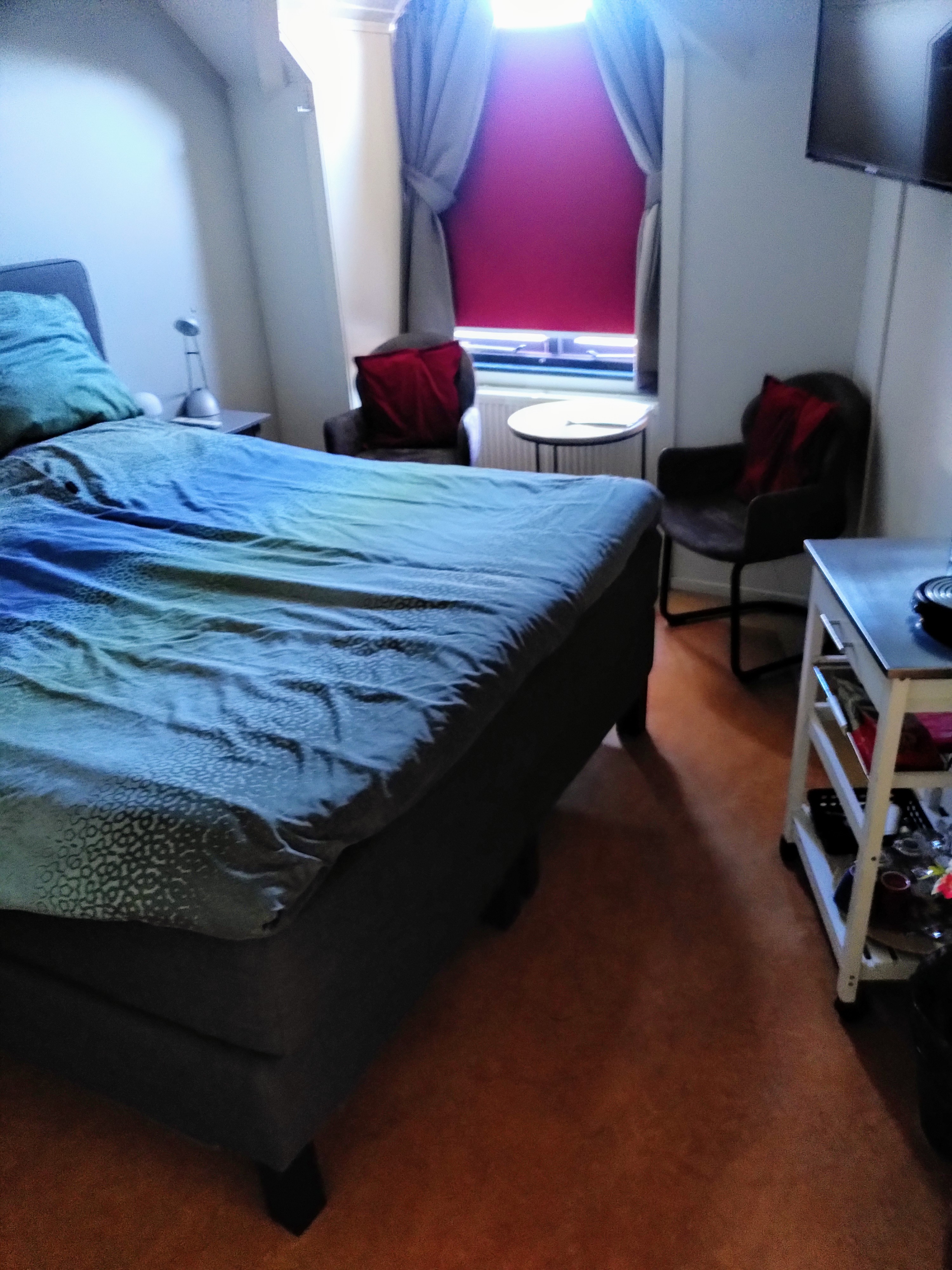 Uw slaapkamer beschikt over een kingsize bed ,en er zijn twee stoelen en een tv aanwezig.